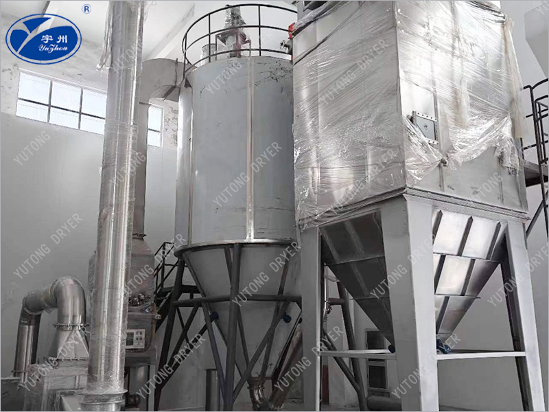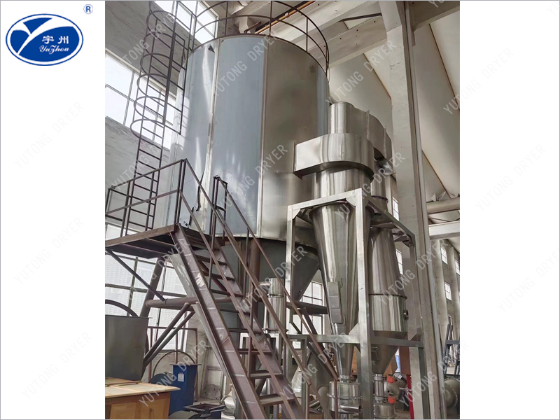 Spray dryer for open circulation, and flow, centrifugal atomization. The drying medium air is filtered by the primary and medium efficiency air filter according to the operation instructions, absorbed by the blower and then heated by the heater through the hot air distributor of the high efficiency filter into the spray drying main tower. The liquid material passes through the peristaltic pump according to the operation instructions, enters the high-speed rotating centrifugal nozzle, and is dispersed into small droplets under the action of centrifugal force. In the main spray drying tower, the small droplets are in full contact with the hot air, and are dried into products after heat exchange along its specific path, and then separated by a cyclone separator, the solid material is collected, and the gas medium is filtered and discharged. The whole spray system is easy to clean, no dead corners, in accordance with GMP requirements.