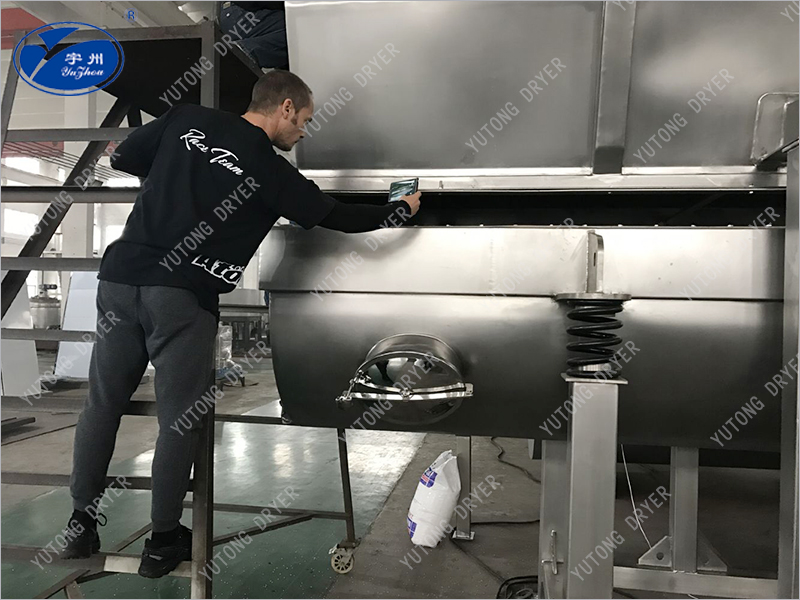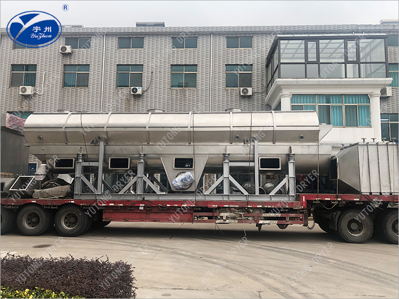 物料自進料口進入機內, 在振動力作用下, 物料沿水平方向拋擲向前連續運動,熱風向上穿過流化床同濕料換熱后, 濕空氣經旋風分離器除塵后由排風口排出, 干燥物料由排料口排出。