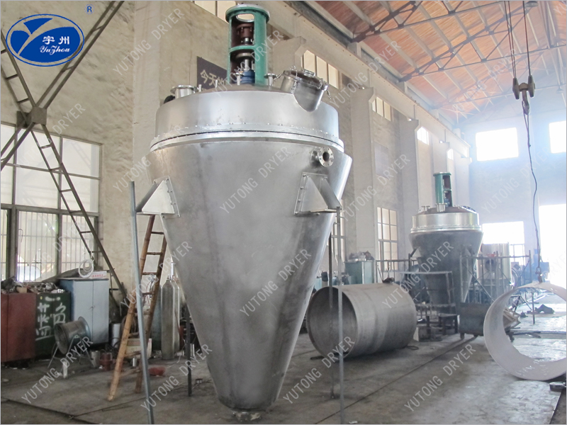 該設(shè)備主體立式靜止,內(nèi)部加熱的螺帶進行圓周攪拌提升運動,物料進入干燥腔體后利用夾套和攪拌螺帶對物料接觸加熱,物料被螺帶有序的攪動,翻轉(zhuǎn)、提升、瀑落,使物料不斷的與加熱腔壁接觸而進行強制熱交換,受熱揮發(fā)的溶媒在真空狀態(tài)下被抽走,從而達(dá)到快速干燥的目的。