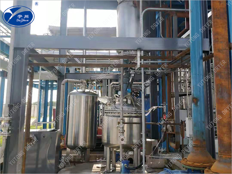 物料從加熱區(qū)的上方徑向進(jìn)入蒸發(fā)器,經(jīng)布料器分布到蒸發(fā)器加熱壁面,然后旋轉(zhuǎn)的刮膜器將物料連續(xù)均勻地加熱面上刮成厚薄均勻的液膜,并以螺旋狀向下推進(jìn)。在此過(guò)程中,旋轉(zhuǎn)的刮膜器保證連續(xù)和均勻的液膜產(chǎn)生高速湍流,并阻止液膜在加熱面結(jié)焦、結(jié)垢,從而提高傳總系數(shù)。輕組份被蒸發(fā)形成蒸汽流上升,經(jīng)汽液分離器到達(dá)和蒸發(fā)器直接相連的外置冷凝器,重組份從蒸發(fā)器底部的錐體排出。 一個(gè)獨(dú)特的布料器不僅僅具有將物料均勻地流向蒸發(fā)器內(nèi)壁,防止物料濺到蒸發(fā)器內(nèi)部噴入蒸汽流,還具有防止剛進(jìn)入的物料在此處閃蒸,有利于泡沫的消除,物料只能沿著加熱面蒸發(fā)。在刮膜蒸發(fā)器的上部配有一個(gè)依據(jù)物料特性設(shè)計(jì)的離心式分離器,將上升蒸汽流中的液滴分離出來(lái)并返回布料器。
