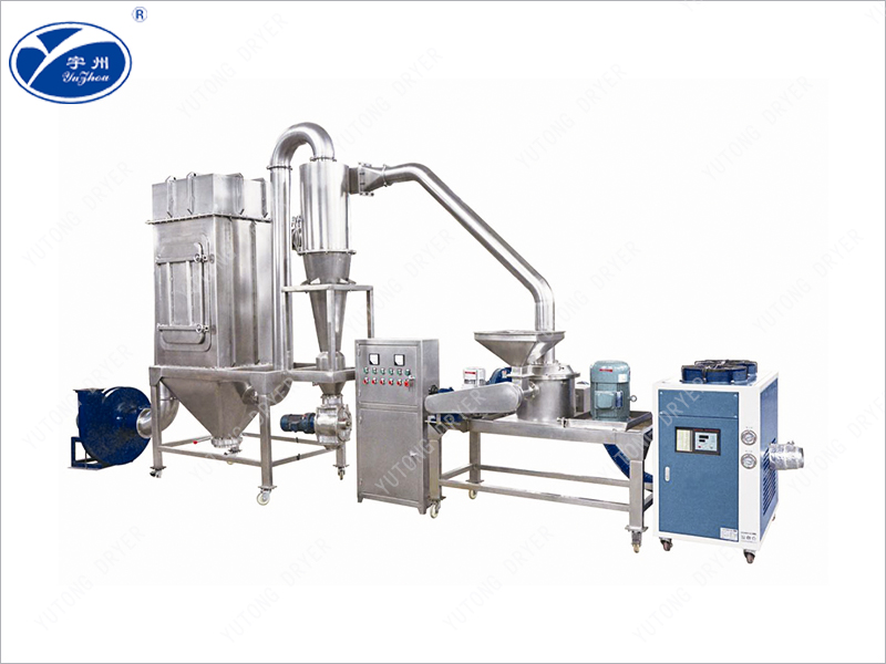 物料由料斗經螺旋輸送器進入粉碎室,粉碎物經高速刀片剪切獲得粉碎,通過負壓風運的方法把物料運入旋風分離器,袋式除塵器、排出物料達到產品的要求。
