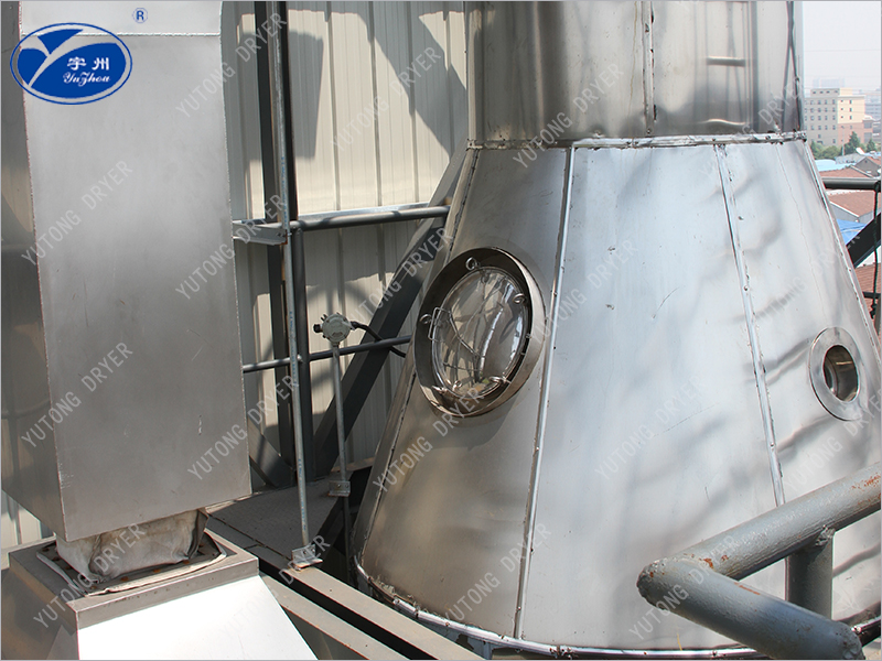 空氣通過濾清器進入加熱器,交換成熱空氣,進去干燥室頂部的熱空氣分配器,使空氣均勻呈旋轉狀或平行軸線進入干燥室。料液需經過篩后由高壓泵送至設在干燥室頂中心的噴嘴,將料液均勻的霧化,使液滴的表面積大大增加,與熱空氣相遇接觸,使水份迅速蒸發,在極短的時間里干燥成為顆粒產品,大部分產品由設在塔底部出料口收集,廢氣和微小粉粒經旋 風分離器分離,成品由旋風分離器下端收集筒收集,廢氣由抽風機排出。