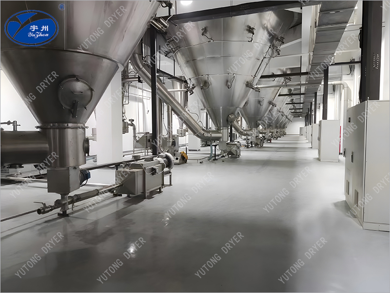 空氣經(jīng)空氣過(guò)濾器后進(jìn)入空氣加熱器,當(dāng)空氣加熱器到給定的溫度后以切線方向進(jìn)入熱風(fēng)分配器,經(jīng)熱風(fēng)分配器作用后的空氣,均勻地、螺旋式地進(jìn)入干燥室,同時(shí)料液由霧化器霧化為20~60um的霧滴,當(dāng)霧滴與熱空氣接觸后就迅速汽化干燥為粉末或顆粒產(chǎn)品。采用旋風(fēng)分離器直接收集后經(jīng)氣力輸送至料倉(cāng),完成物料的冷卻及輸送,廢氣由風(fēng)機(jī)排出口經(jīng)水沫除塵器排出。