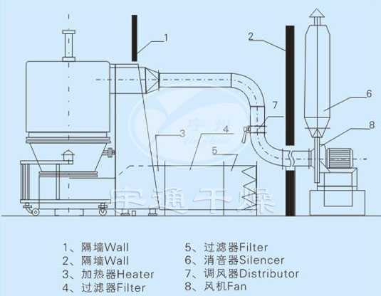 空氣在高壓離心通風機的作用下,經(jīng)過空氣過濾器過濾,進入空氣熱交換器加熱至設定溫度,然后通過氣體分布板形成無數(shù)高速氣流束沖擊物料,氣束間所形成的負壓作用物料,使之成為沸騰狀。此狀態(tài)下熱空氣與物料廣泛地接觸,增強了傳熱過程,因而在較短的時間內促使物料中的水份蒸發(fā)、分離。濕氣流透過捕集袋由風機排出,被捕集袋截留在沸騰器內的物料則為干燥產(chǎn)品。
