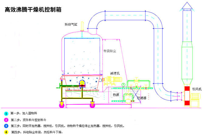 6、物料干燥后關閉電機-停引風機-手動清灰數(shù)次-“頂降”料斗-出料。