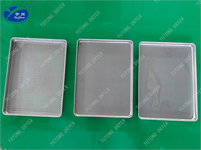 13、在上述各烘盤中,又以一次成型壓制烘盤為普遍,尺寸為640×460×45mm,主要由不銹鋼或鋁合金通過一次成型的方式壓制而成,其角落光滑、四周翻邊,保證了清洗徹底,及容易端托的優點,因而廣泛使用在生產中。